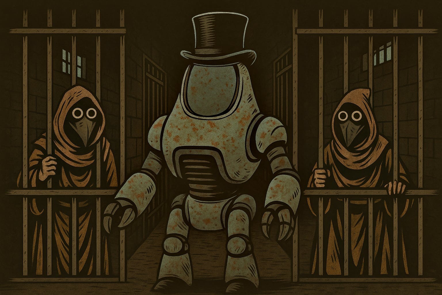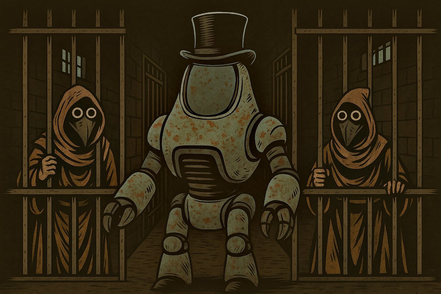 Events take a dark turn when Sam and Raven attempt to interrogate their captive cultists at the jail, where they find Mayor Smiles reciting U.S. history alongside a Protectron guard. Despite one cultist's (un)willingness to talk, negotiations break down when Sam escalates the interrogation. In a shocking turn, the second cultist commits ritual suicide, his body erupting into supernatural vines that breach the building's foundation.