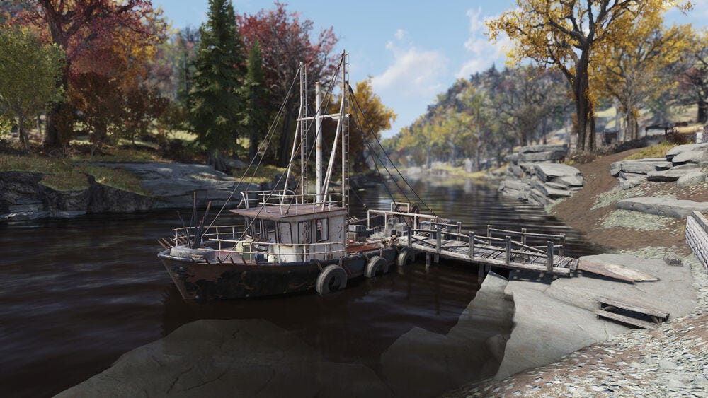 Our team shoved off, but they weren’t alone. Rusty Dusty Bones, the friendly ghoul farmer and trader, hitched a ride — with his ever-loyal brahmin Betsy in tow — as the boat glided down the murky waters of the Ohio River.